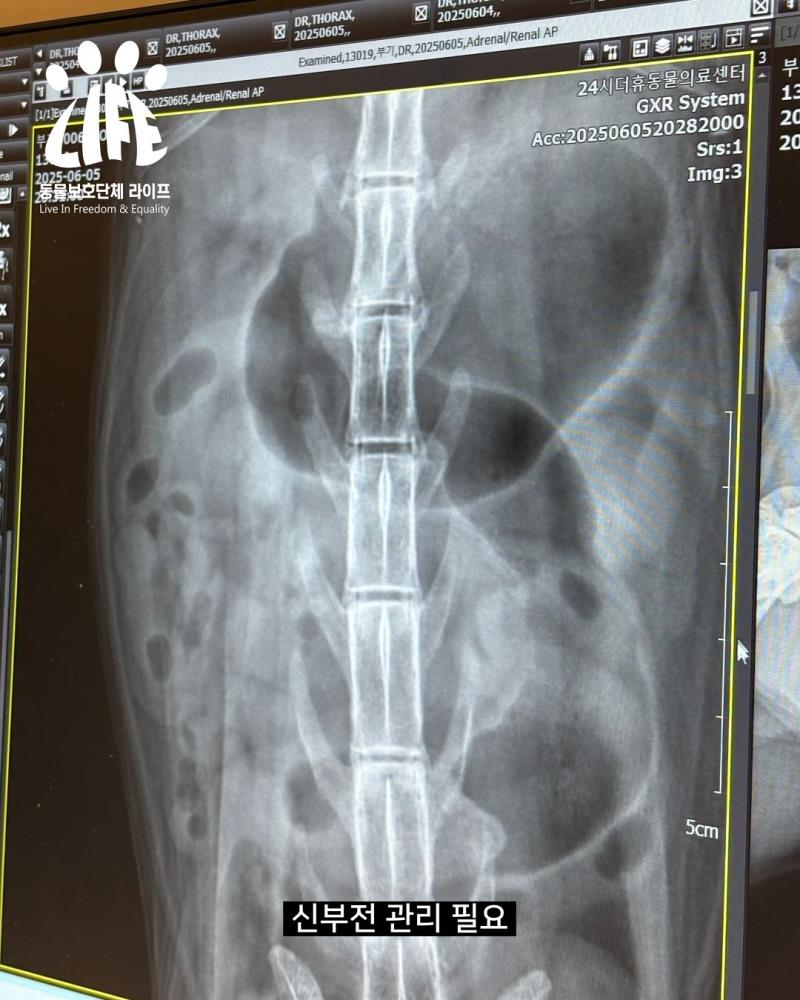 아이에게 ’꼬부기‘라는 이름을 붙여주고, 병원 진료에 들어갔습니다. ’부기‘는 8~9살 추정의 남자 아이로 중성화가 되어있었고 다른 특이점은 없었으나 신부전이 확인되었습니다.