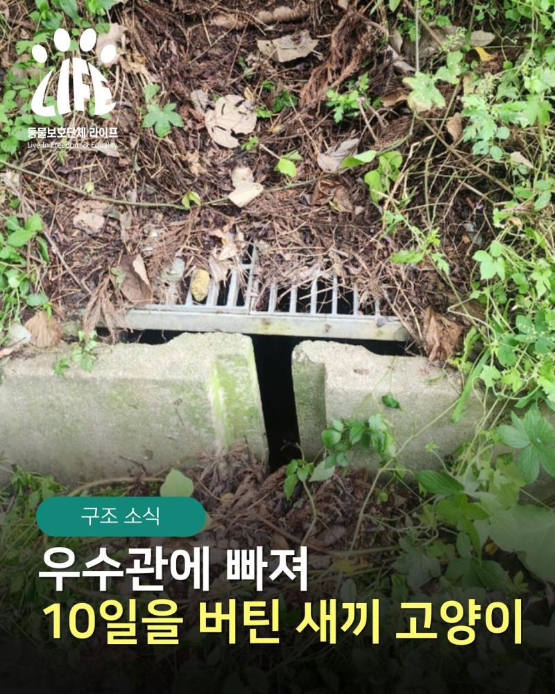 다음날 오전, 다시 찾은 그 곳에서 희미하게 들리는 새끼 고양이 울음소리. 많이 지친듯 보였습니다. 비까지 내려 더욱 구조가 시급한 상황!