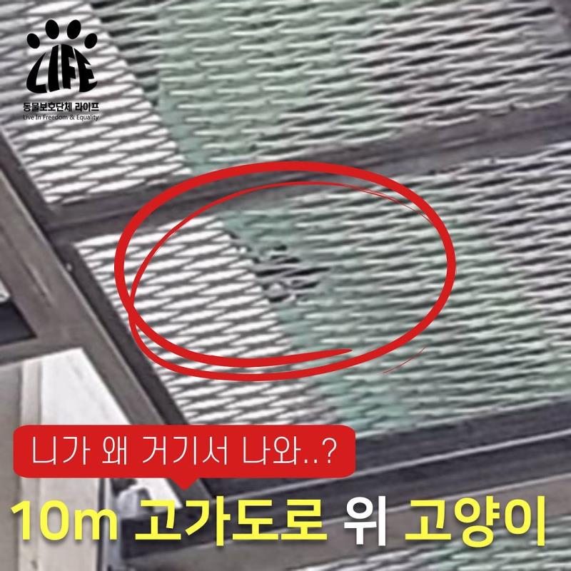 스스로 올라갔다고 보긴 어려운 환경에서.. 추측하기로는 대형 트레일러 아래 숨어 지내다 도로에서 떨어진 것으로 보였습니다.