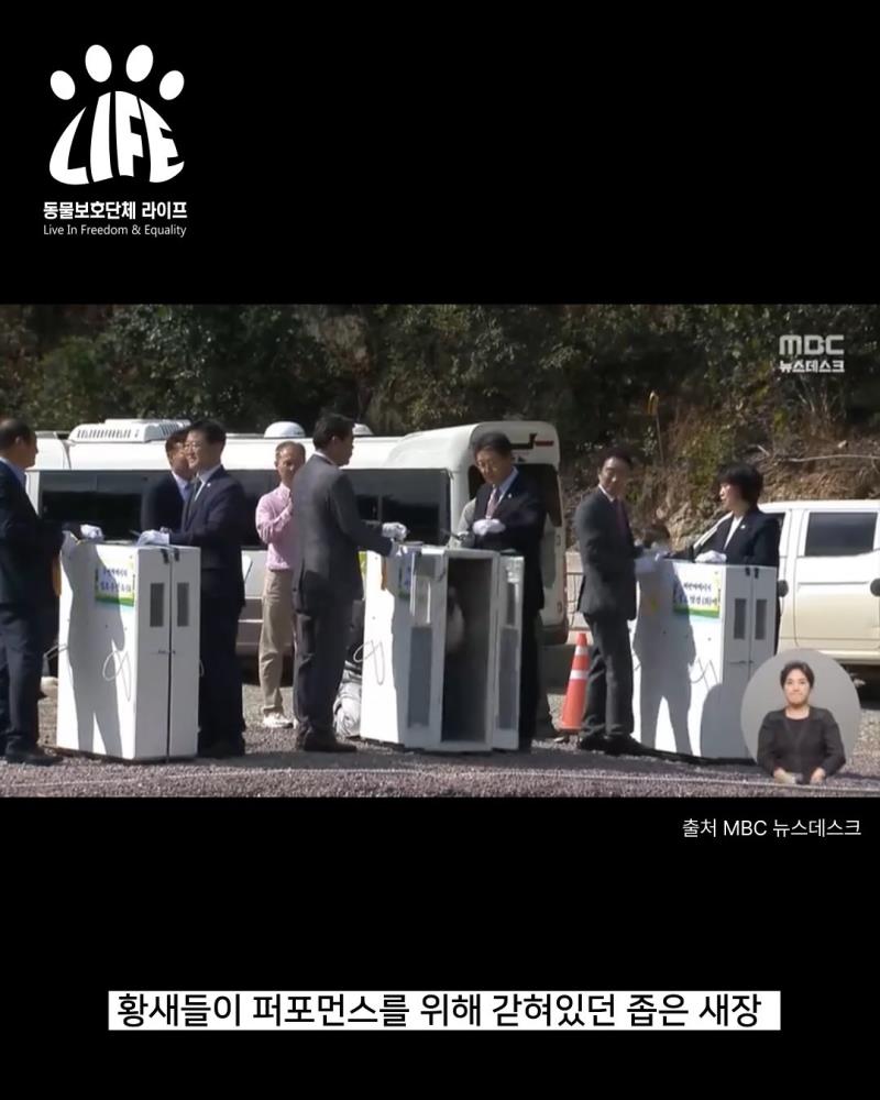 김해시 기념행사에서 땡볕 아래 좁은 새장에 갇혀 있던 황새 한 마리가 결국 탈진으로 숨졌습니다. 대기한 시간이 무려 100분이라고 알려졌습니다.생명을 ‘행사 퍼포먼스용’으로 이용한 이번 사건은 관리 소홀 등 책임이 뒤따라야 할 것입니다.동물보호단체 라이프 법률지원센터는 이번 사안에 대해 법률 검토를 진행하고 관련 책임을 끝까지 물을 예정입니다.사진 출처 : MBC 뉴스데스크